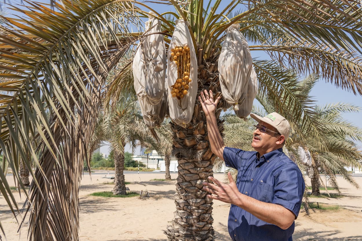 在國際生物鹽鹼農業中心(ICBA)的實驗農場,一整排海棗樹結滿金黃果實。我們難掩激動,ICBA水文及水文地學首席科學家、永續自然資源管理專案主持人哈立歐.阿瑪(Khalil Ammar)似乎有所察覺,關切地問:「大家都吃過椰棗了嗎?」